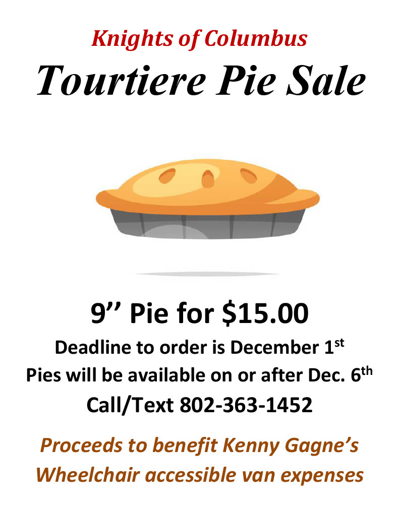 Tourtiere Pie Sale, deadline to order is December 1,2025. $15.00 for a 9″ pie. Call/texr 802-363-1452.