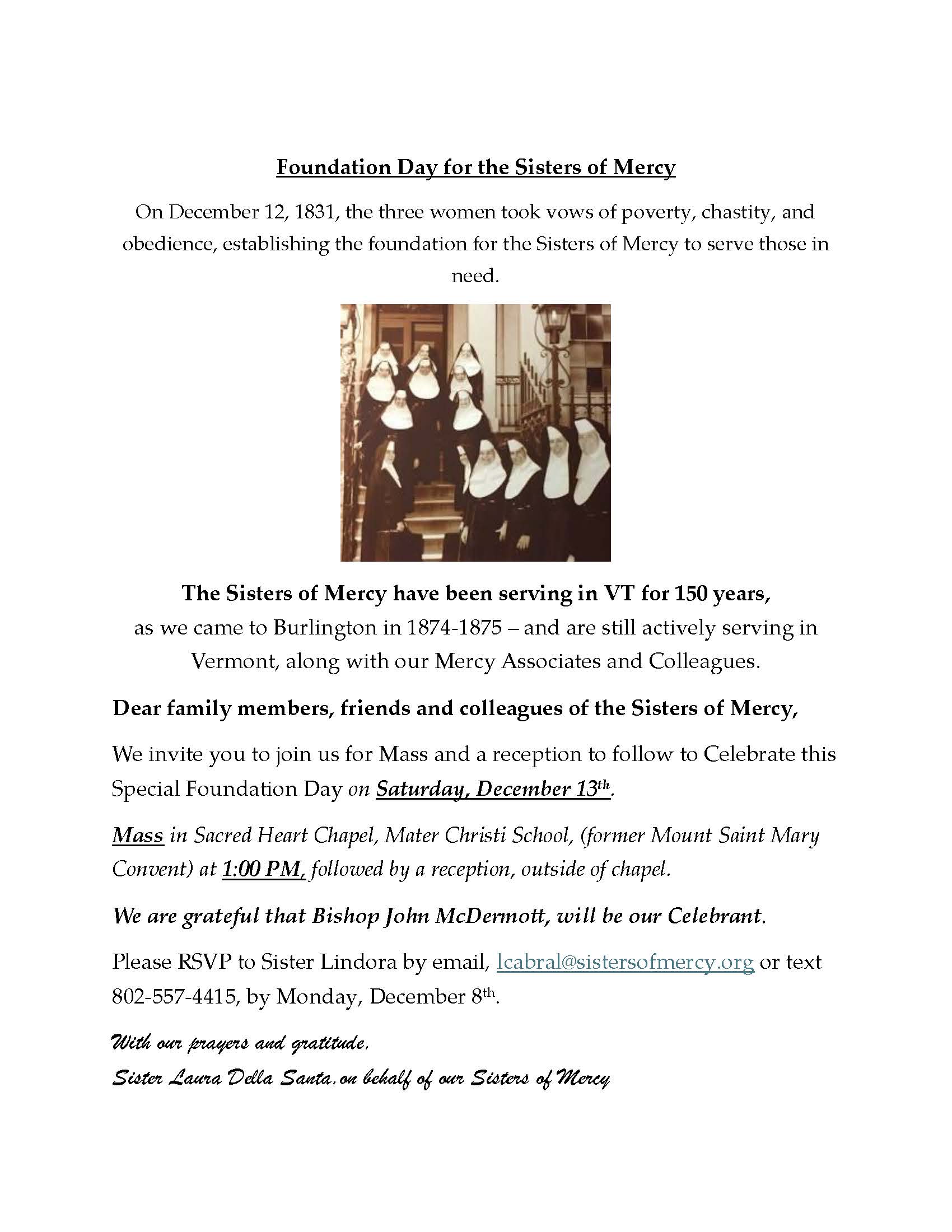 The Sisters of Mercy have been serving in VT for 150 years, as we came to Burlington in 1874-1875 – and are still actively serving in Vermont, along with our Mercy Associates and Colleagues. We invite you to join us for Mass and a reception to follow to Celebrate this Special Foundation Day on Saturday, […]